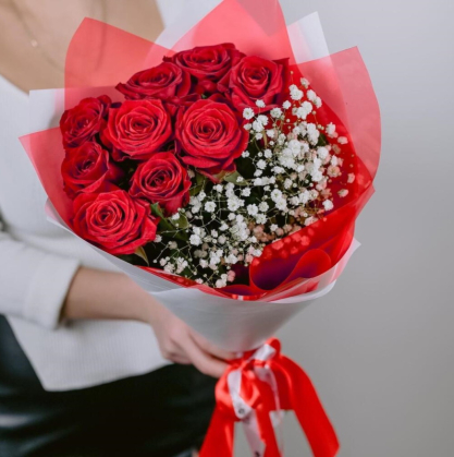 Букет из красных роз и гипсофилы | Купить в Калуге